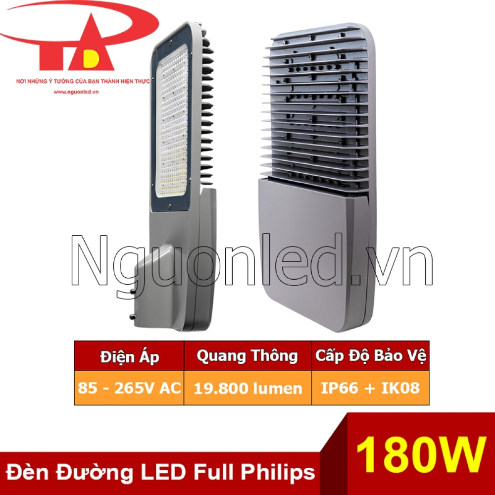 - Đèn đường LED Full Philips 180W là dòng đèn phù hợp với những công trình ngoài trời cần nguồn sáng mạnh, ổn định và bền bỉ trong thời gian dài. Tên gọi “Full Philips” ở đây được hiểu là bộ đèn sử dụng chip LED Lumileds 3030 và driver Philips Xitanium – hai linh kiện cốt lõi quyết định hiệu quả chiếu sáng và độ ổn định vận hành. Các chi tiết còn lại như thân vỏ, kính, dây điện, ốc vít và phần hoàn thiện cơ khí do Công ty An Đức Phát hoàn thiện, nhờ đó bộ đèn vẫn giữ được độ chắc chắn, khả năng chống nước tốt, tiết kiệm điện và phù hợp với nhiều công trình ngoài trời.