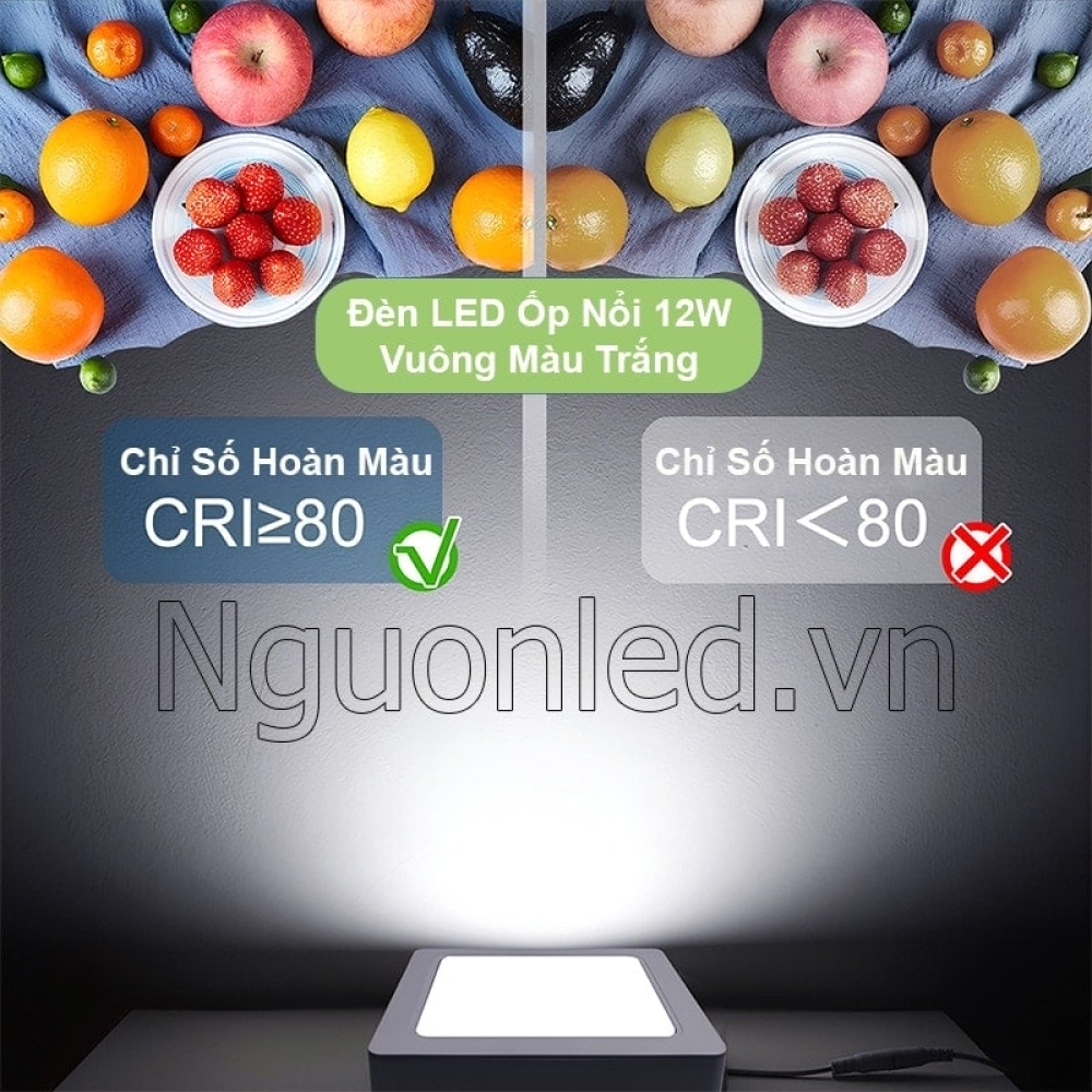 - Một trong những yếu tố giúp đèn LED ốp nổi 12W vuông màu trắng được đánh giá cao trong phân khúc dân dụng là chỉ số hoàn màu (CRI) đạt trên 80Ra – mức tiêu chuẩn của các dòng đèn LED chất lượng cao hiện nay. CRI càng cao, màu sắc vật thể càng được tái hiện gần với ánh sáng tự nhiên, cho cảm giác trung thực, sống động và dễ chịu cho mắt.