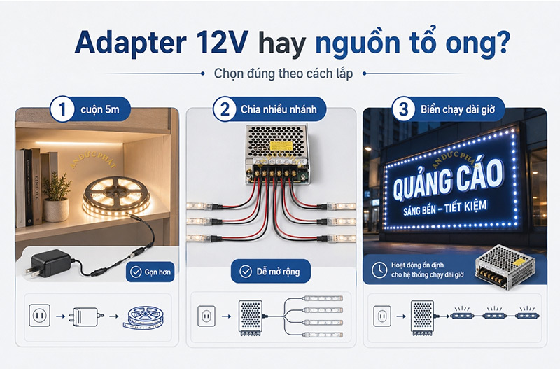 Lỗi đầu tiên là thấy cùng 12V rồi chọn theo cảm tính. Điện áp đúng mới chỉ là điều kiện cơ bản. Còn hệ thống chiếu sáng dùng LED dây 12V của bạn lớn hay nhỏ, chạy đơn hay chia nhánh mới là thứ quyết định nên dùng adapter hay nguồn tổ ong.