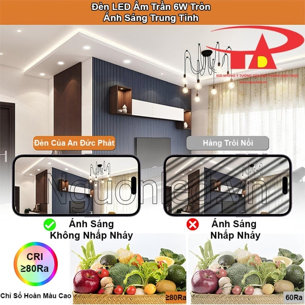 - Không phải ai cũng biết rằng nhiều loại đèn LED thông thường tuy nhìn bằng mắt thường có vẻ sáng ổn định, nhưng khi quay video hoặc sử dụng lâu lại xuất hiện hiện tượng nhấp nháy (flicker) nhẹ. Sự dao động tần số này khiến mắt phải điều tiết liên tục, gây mỏi, nhức đầu hoặc giảm tập trung khi làm việc trong thời gian dài. Đèn âm trần tròn 6W màu trung tính được trang bị công nghệ chống nhấp nháy thế hệ mới, giúp ánh sáng phát ra ổn định, liền mạch và êm dịu – mang lại cảm giác tự nhiên như ánh sáng ban ngày.