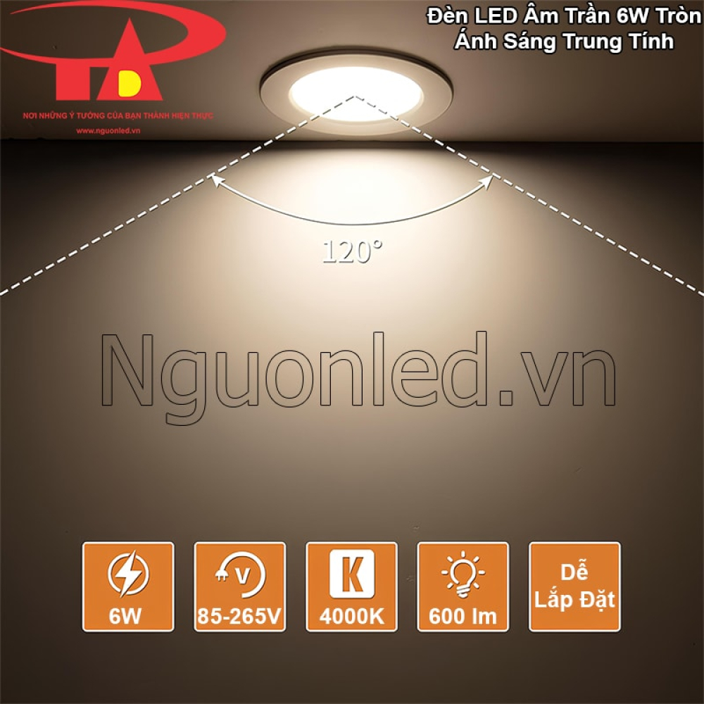 - Đèn âm trần tròn màu trung tính được thiết kế dựa trên nguyên tắc hiệu suất quang học tối đa và tiêu thụ điện năng tối thiểu, mang lại giải pháp chiếu sáng vừa mạnh mẽ vừa tiết kiệm. Nhờ sử dụng chip LED SMD hiệu suất cao, đèn tạo ra quang thông lên tới 600 lumen, trong khi chỉ tiêu thụ 6W điện năng – thấp hơn nhiều so với các loại bóng huỳnh quang hoặc compact truyền thống có cùng độ sáng.